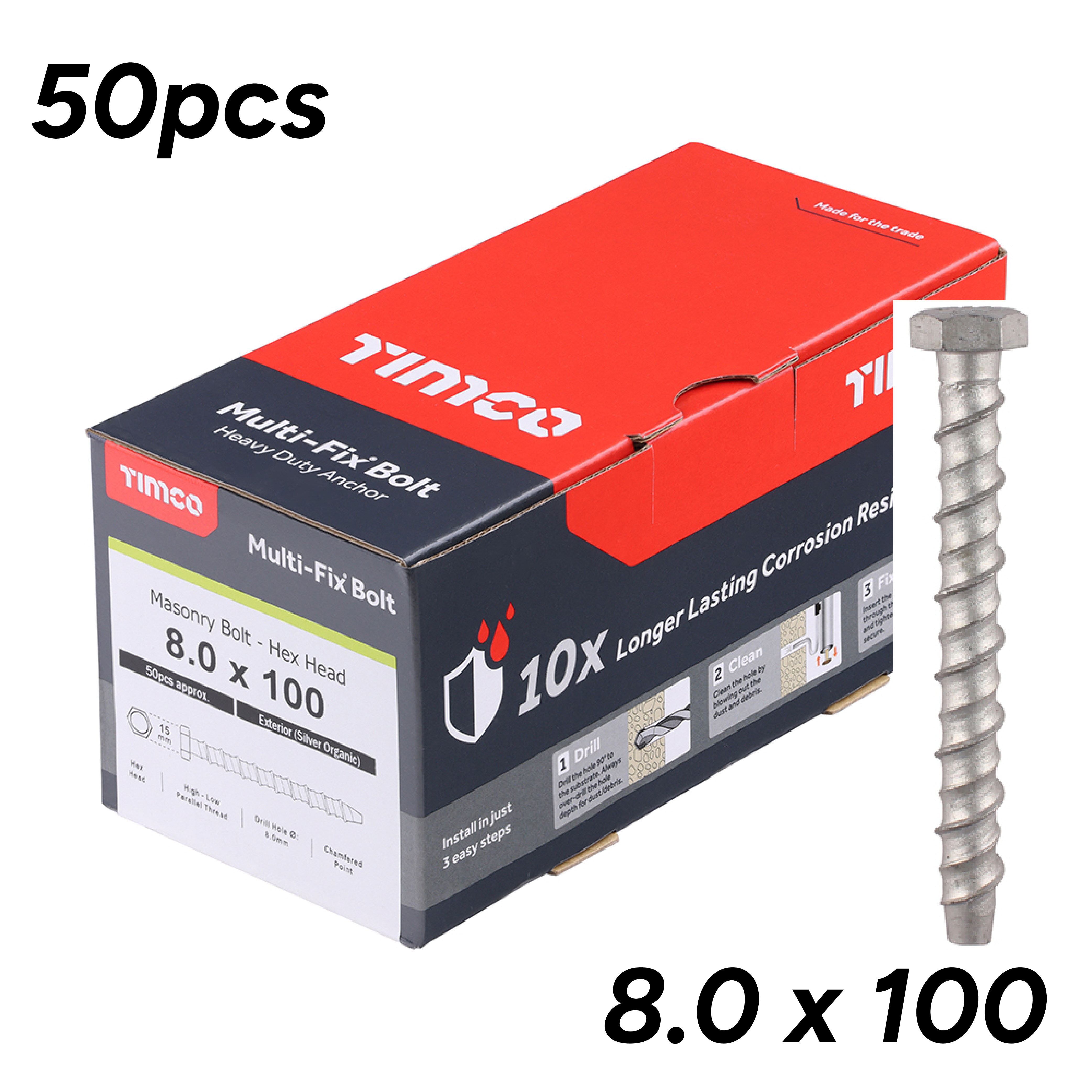 8.0 x 100 – Multi-Fix Masonry Bolts – Hex – Exterior – Silver 50 pcs