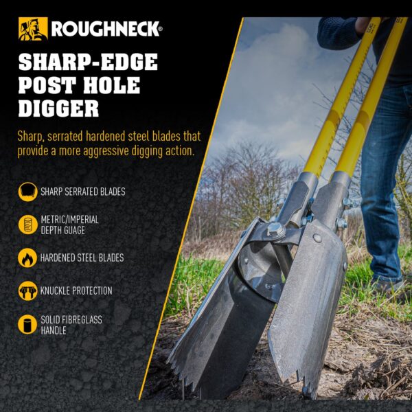 The Roughneck Sharp Edge Posthole Digger has sharp, serrated hardened steel blades that provide a more aggressive digging action than traditional posthole diggers.